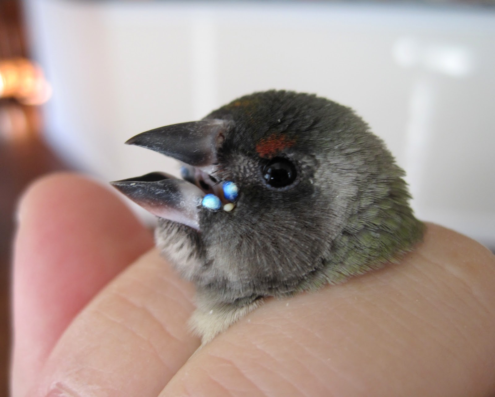 While I do not normally hand feed any of my birds, sometimes if the parents do not feed for some reason and no fosters can be found, I will take over care. For grasskeets, occasionally a very late hatching egg can lead to a baby being much smaller than the rest of its siblings. It may not be able to get enough food at feeding time. I found such a baby and had to take over. While it was getting some feeding from its parents for a few days, it became dehydrated and weaker since its siblings are now 5 times its size. So far it's looking a lot less dehydrated, so hopefully it will make it.